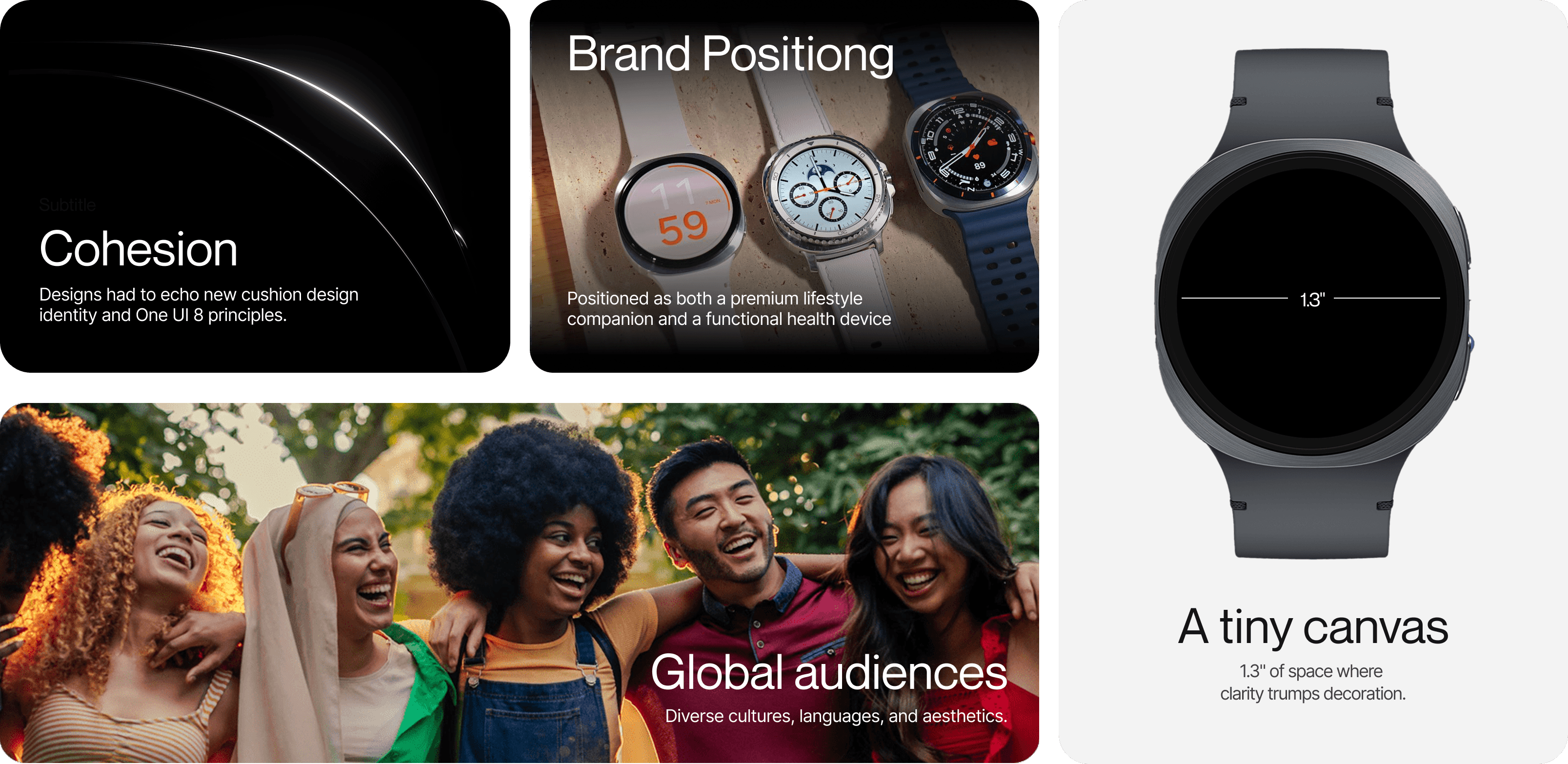 Tasked with designing the visual identity for One UI 8 Watch, the goal was to harmonize a new, cushion-inspired geometry with an interface that feels alive.